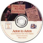 Acton to Acton Acton's Historian, Meryl G. Adams, packed her bags and went for a 3 week visit to Acton, England in 1952. While in England, she presented movies and gave speeches to Rotary Club and Acton Angelo American Association as Ambassador of Goodwill for Antelope Valley. Footage from that trip depicts the sisterhood of the two towns. Also highlighted is Acton 1952 footage of Blum Ranch, Columbo Lilac Ranch, Scanlon Ranch, Acton Community Presbyterian Church, building of Acton Community Club, Acton Post Office and Acton Grocery. Early views of Acton are breathtaking and show the wild flowers of spring. #2404 $20 |